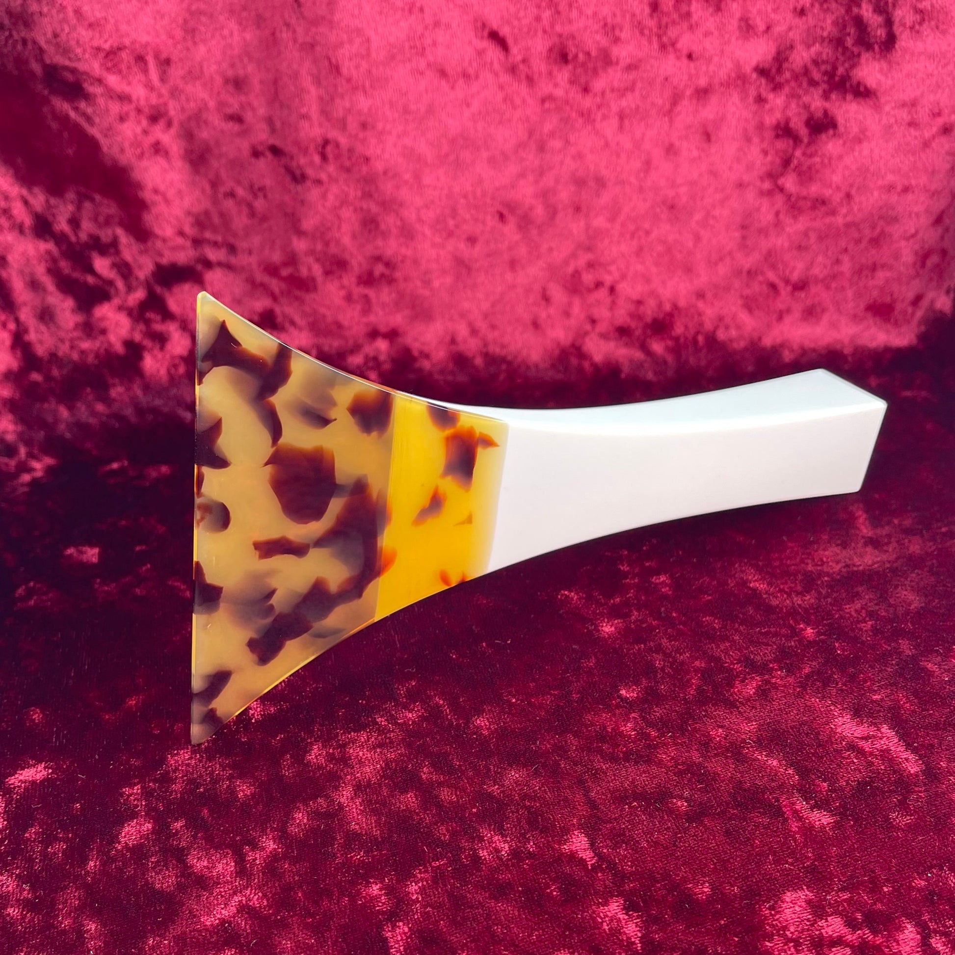 A tortoiseshell-style bachi crafted from high-quality synthetic materials.